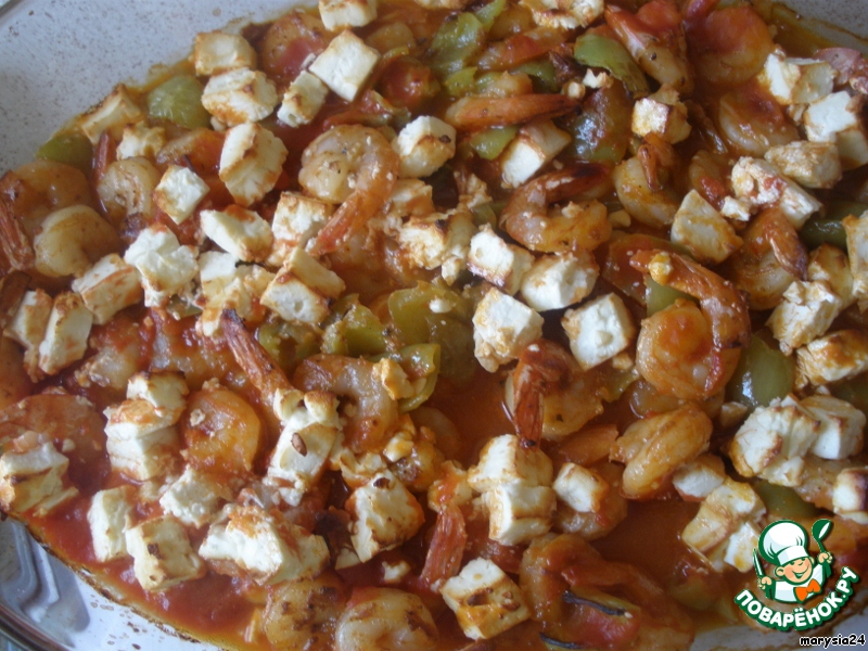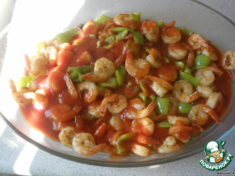 Выкладываем туда креветки со всем остальным, заливаем томатным соком.