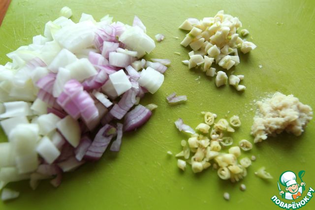 Теперь нам понадобится большая сковорода, лучше вок. На сливочном масле обжариваем лук, тертый имбирь, чеснок и перец чили. Регулируйте остроту блюда по своим предпочтениям, уменьшая или увеличивая количество перца чили.