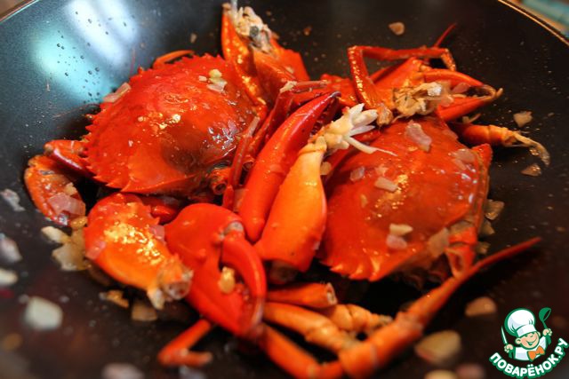У приготовленного краба отламываем клешни и лапки от панцыря, закладываем в вок и как бы обволакиваем нашей пассeровкой.