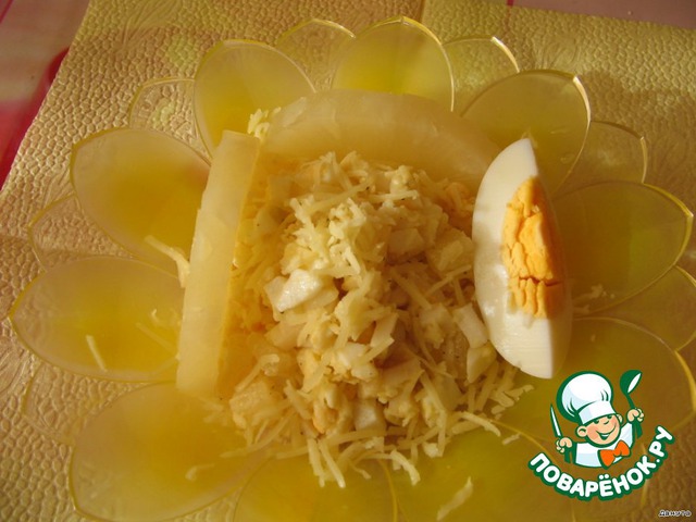 Оформляем по вкусу. Я украсила полукольцами ананаса, долькой яйца и посыпала тертым сыром.