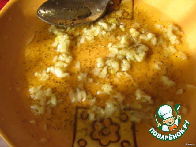 Делаем заправку: смешиваем оливковое масло, лимонный сок, измельченный чеснок, соль и перец.