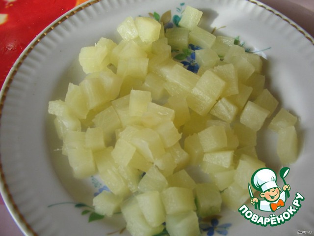 Ананасы (у меня были колечки) обсушить и нарезать мелкими кубиками.