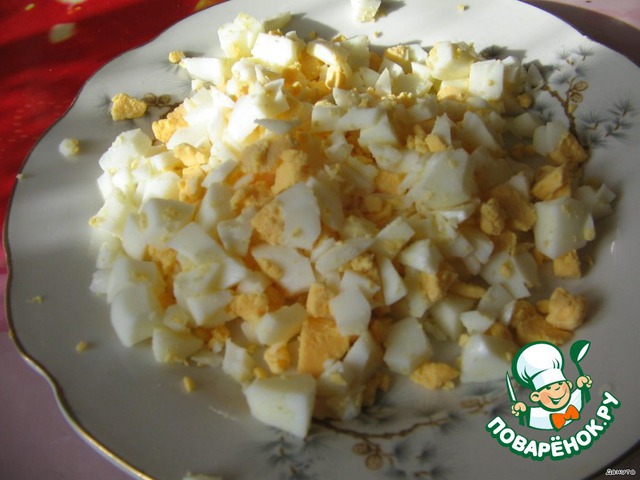 С яйцами поступить так же, только оставить пару долек для украшения.