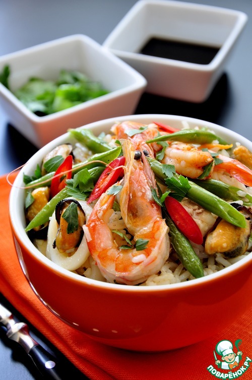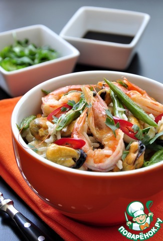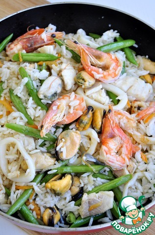 | Легкий и полезный плов с морепродуктами. Идеален к белому вину и салатам из свежих овощей. |
