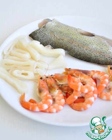 Кальмара и креветки разморозить, мидии очистить от ракушек, форель выпотрошить.