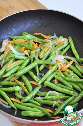 Овощи помыть, обсушить. Лук нарезать полукольцами, морковь соломкой. Фасоль очистить от хвостика, если слишком крупная, разрезать пополам.