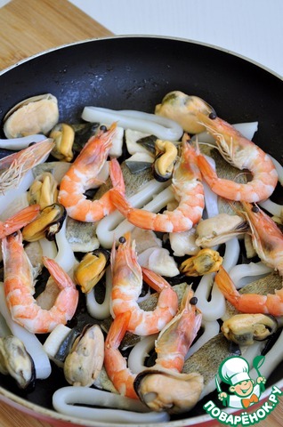 Отдельно обжарить морепродукты - сначала рыбу, затем 1-2 минуты кальмара, креветки и мидии.