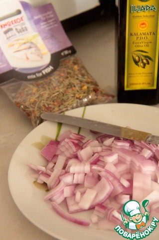 Мелко порежем красный лук, возьмем специи для рыбы (у меня местные) и оливковое масло.