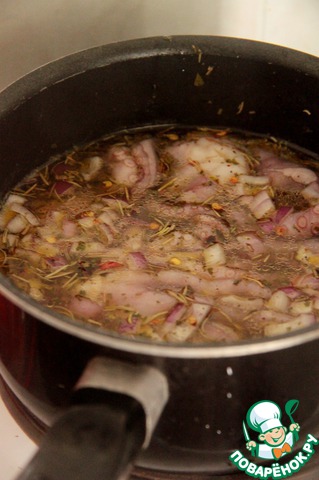 Положим в кастрюлю лук и оливковое масло, немного пассируем до мягкости, затем кладем осьминога, специи и наливаем воду так, чтобы осьминог был закрыт жидкостью.