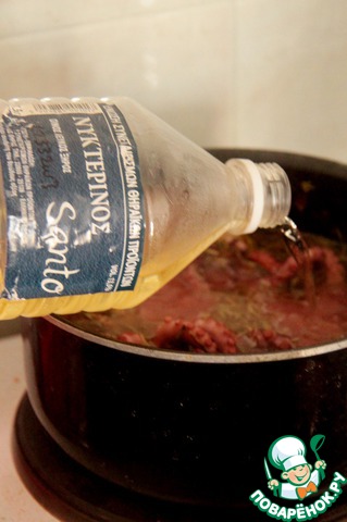 Как только вода закипит, доливаем вино и томатную пасту и снова доводим до кипения.