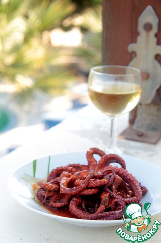 Если вы любите более острое, то можно добавить немного чили. Выкладываем нашего осьминога на тарелку, наливаем вино и наслаждаемся нежным вкусом морепродуктов.