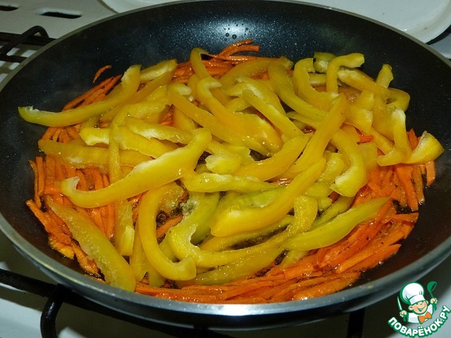 Добавить к моркови перец болгарский, перемешать и продолжать обжаривание. Минуты через 3-4 вылить в сковороду сухое белое вино, прибавить огонь и, быстро помешивая содержимое сковороды, довести до выпаривания вина.