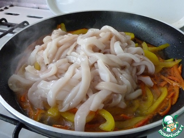 И заключительный этап - выложить в сковороду фунчозу. Фунчоза должна прогреться, пропитаться выделившимся в сковороде соком и равномерно смешаться с кальмарами и овощами. Для этого несколько раз аккуратно всё перемешиваем, фунчозу при этом надо как бы приподнимать. Минут через 5 (примерно) плиту выключить, сковороду снять.