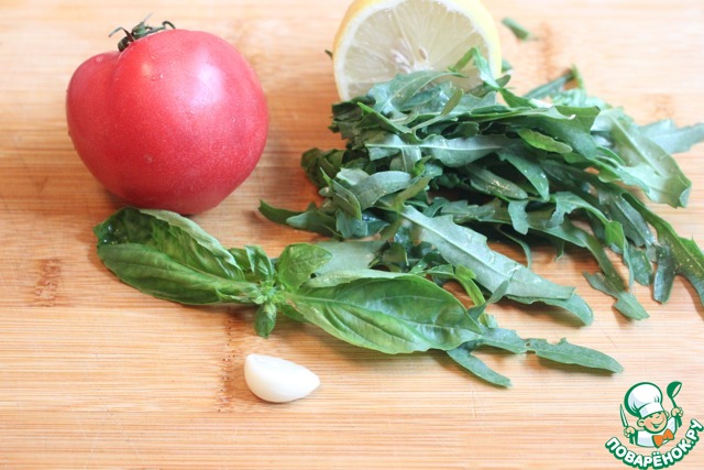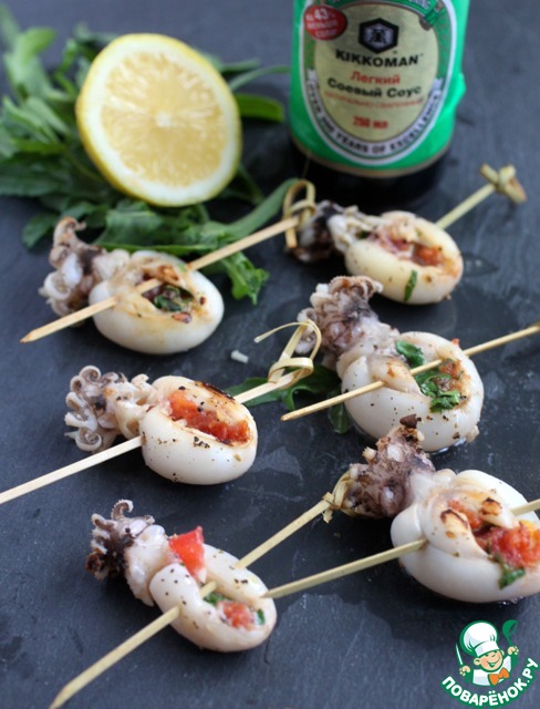 Для фаршировки каракатиц нам понадобится один помидор салат фризе (к сожалению я его не нашла и заменила рукколой), зубчик чеснока, пару листиков зеленого базилика, 2 ст. л. оливкового масла, сок лимона и конечно же натурально сваренный легкий соевый соус Kikkoman. В оригинале еще идут каперсы, но я их исключила.