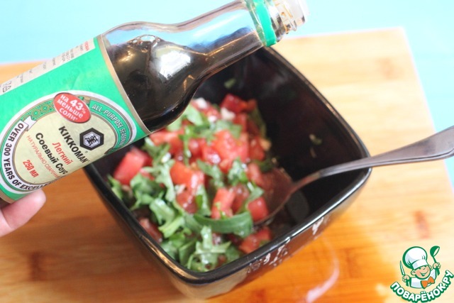 И так снимаем шкуру помидора и нарезаем на маленькие кубики, мелко рубим листики базилика и чеснок, а фризе нарезаем примерно по три сантиметра. Смешиваем с лимонным соком, маслом и соевым соусом.