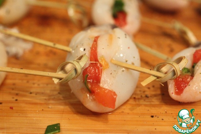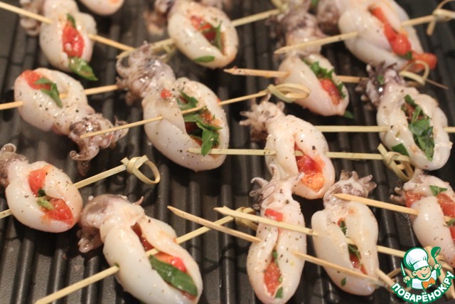 Каракатицы разморозить и просушить. Каждую штуку фаршируем начинкой и закрепляем шпажкой. Перчим смесью перцев.