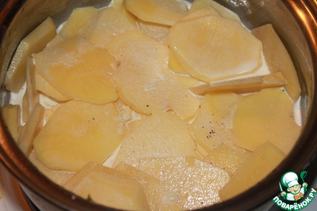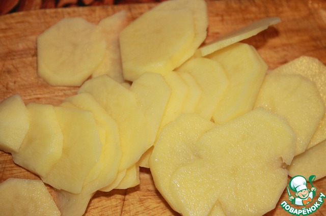 Картофель нарезать тонкими пластинками