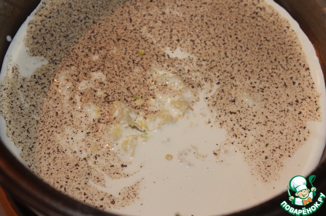 Сливки соединить в сотейнике с выдавленным чесноком, черным перцем