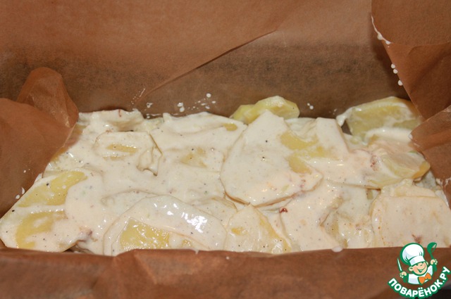 Затем картофель со сливками выложить в форму, выстланную пергаментом и отправить в разогретую до 200 градусов духовку на 40 минут, предварительно закрыв фольгой.