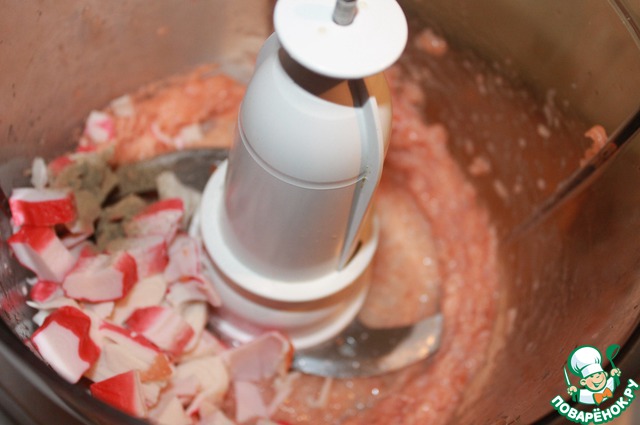 Лосось измельчить с сырым яичным белком до пюреобразной консистенции, добавить цедру лайма, крабовые палочки и еще измельчить, но чтобы кусочки небольшие остались