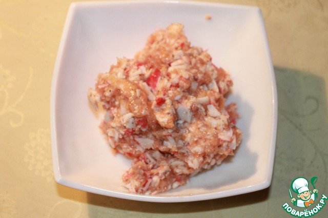 Сырой лосось освободить от косточек, крабовые палочки нарезать кусочками