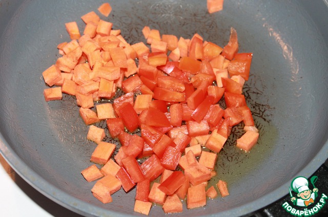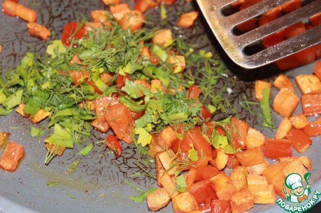 Перец болгарский и морковь нарезать кубиками и слегка поджарить на оливковом масле, добавить рубленую зелень