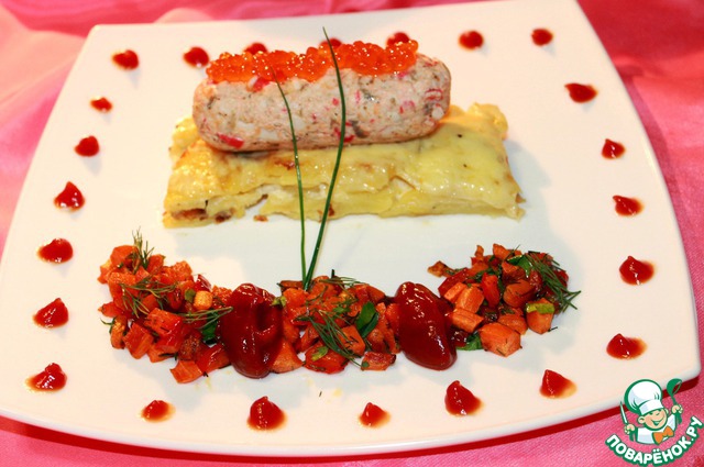 | Нежное ароматное сытное блюдо. Нежный мусс возлежит на ароматном картофельном гратене, а на гарнир хрустящие поджаренные овощи с ярким томатным кули. Благодаря крабовым палочкам А`море мусс приобрел структурность, и ярко выраженный вкус. Очень рекомендую |