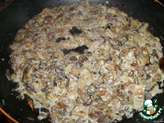 Посолим и поперчим грибочки по вкусу и в конце жарки добавим пару ложек сметаны. Размешаем и потушим еще пару минут.