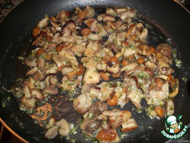 Добавим мелко нарезанные грибы. Я брала замороженное ассорти, так как свежих ароматных грибов у нас, увы, найти трудно, а именно в замороженном ассорти есть опята, которые имеют необыкновенный аромат и придадут нашему блюду особую прелесть:)