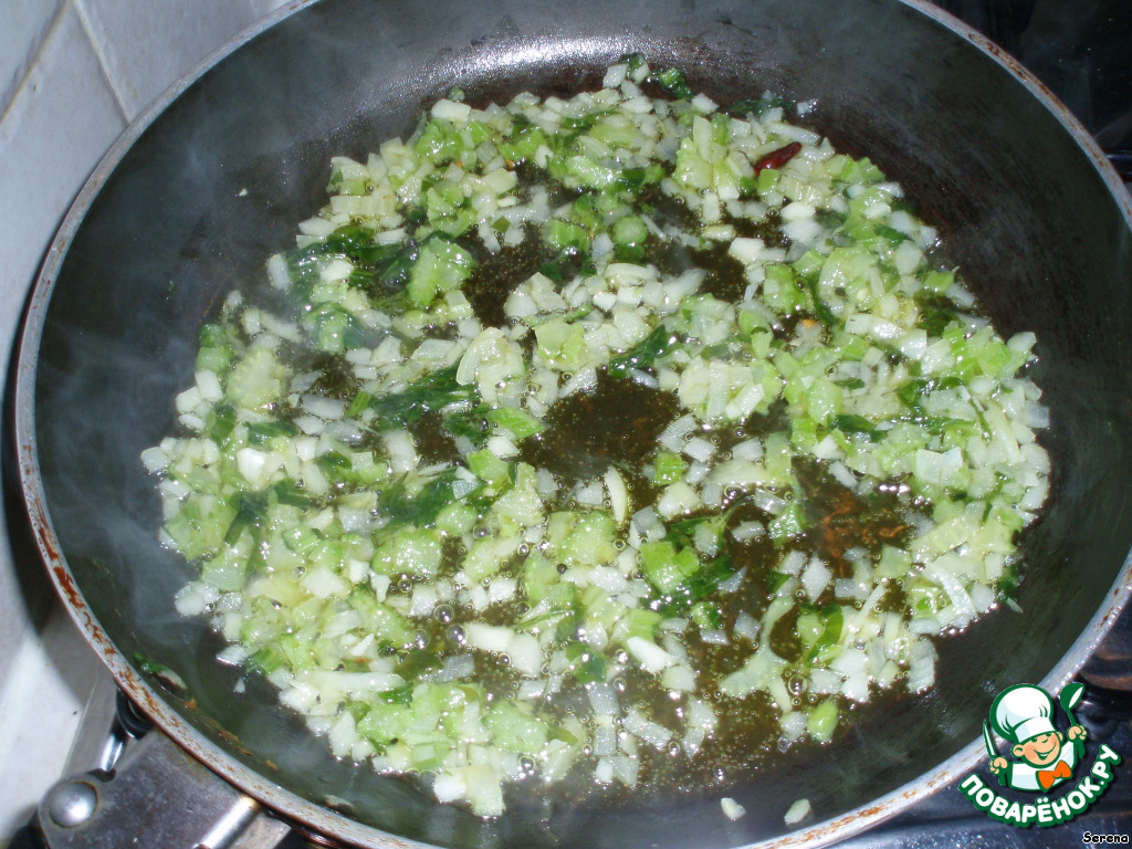 Пока варятся осьминоги, нарезать мелко лук, сельдерей, чеснок и (если нравится)поджарить вместе с измельчённым перчиком.