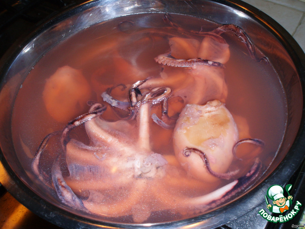 Очистить хорошенько от плёнки, вывернуть мешок, вытащить внутренности и вернуть в исходное положение. Отрезать глаза и вытащить рот осьминога, который находится между щупальцами. Процедура не для слабонервных)))
