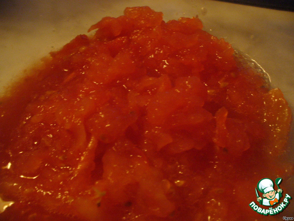 Для начала, чтобы потом не отвлекаться, нужно мытые помидоры натереть на мелкой терке. Кожицу с них я не снимала: в процессе она сама осталась у меня в руках.