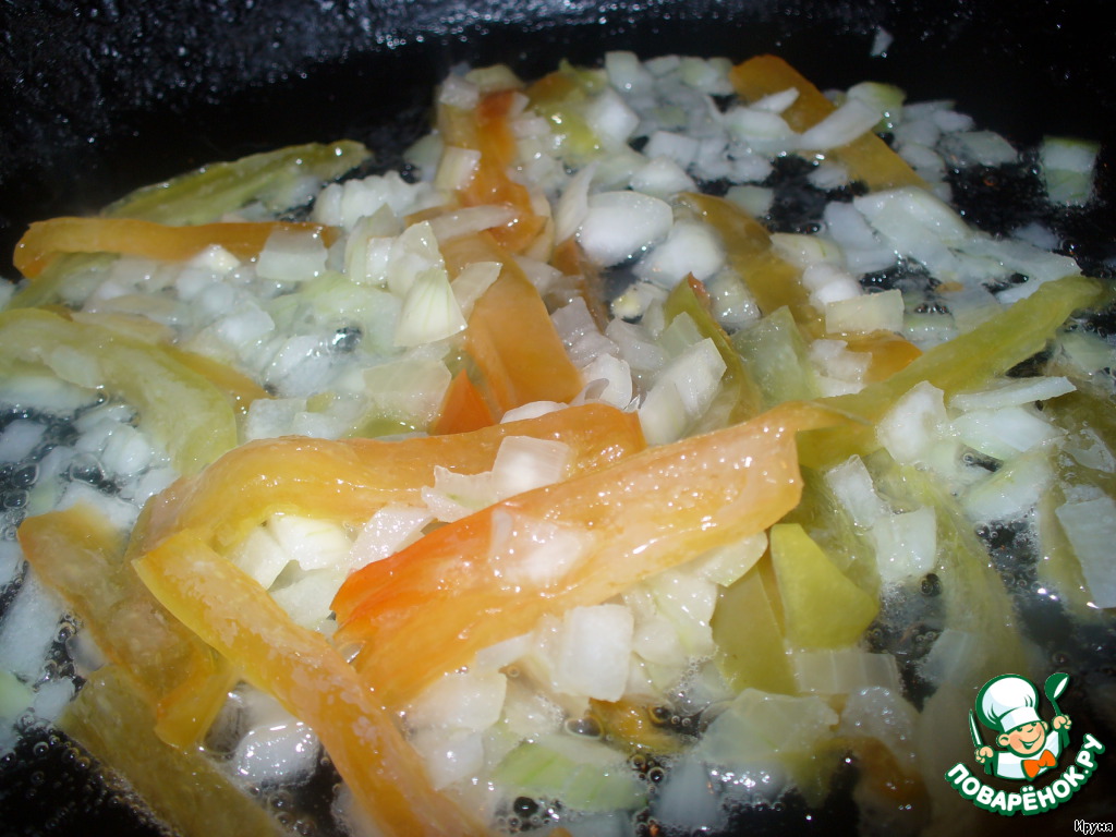 В большой сковороде (или лучше, как я поняла на будущее, в воке) разогреть масло. Обжарить в нем лук и перец.