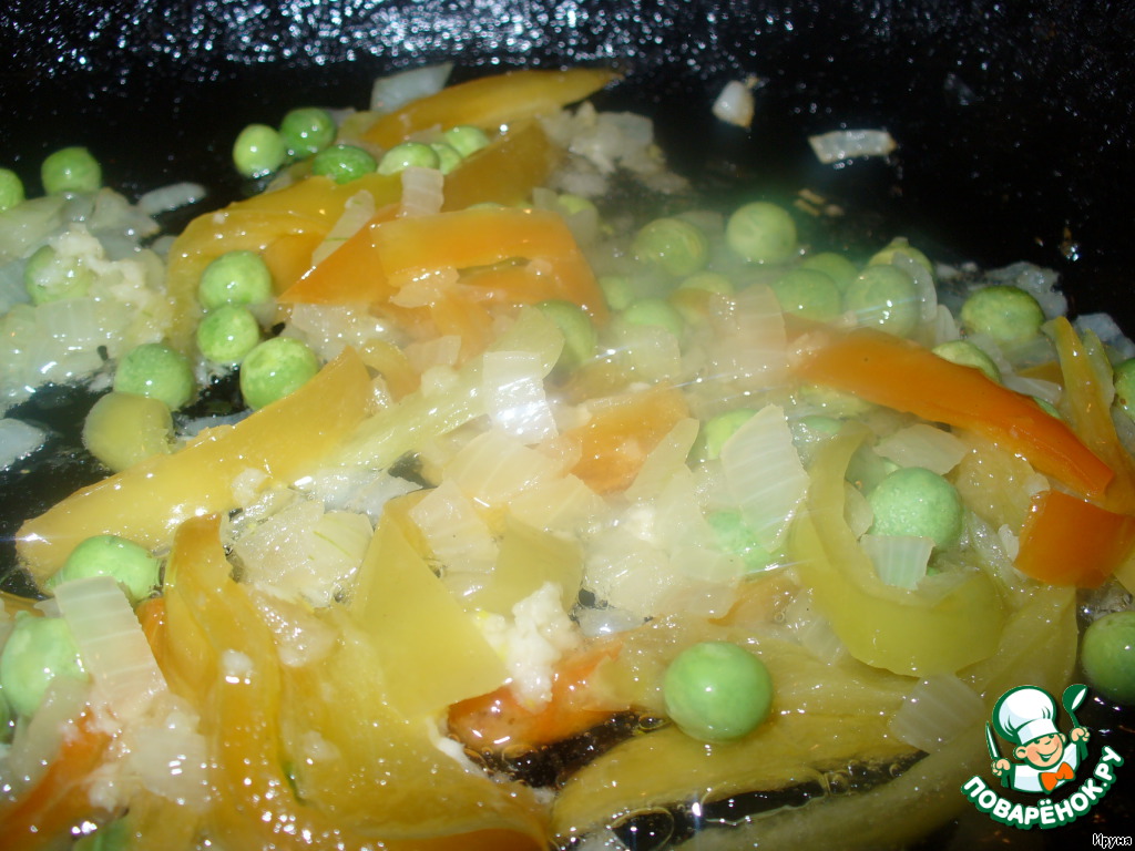 Добавить пропущенный через пресс чеснок, замороженный зеленый горошек. Обжарить.
