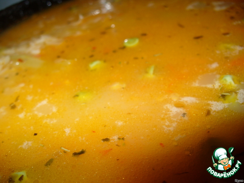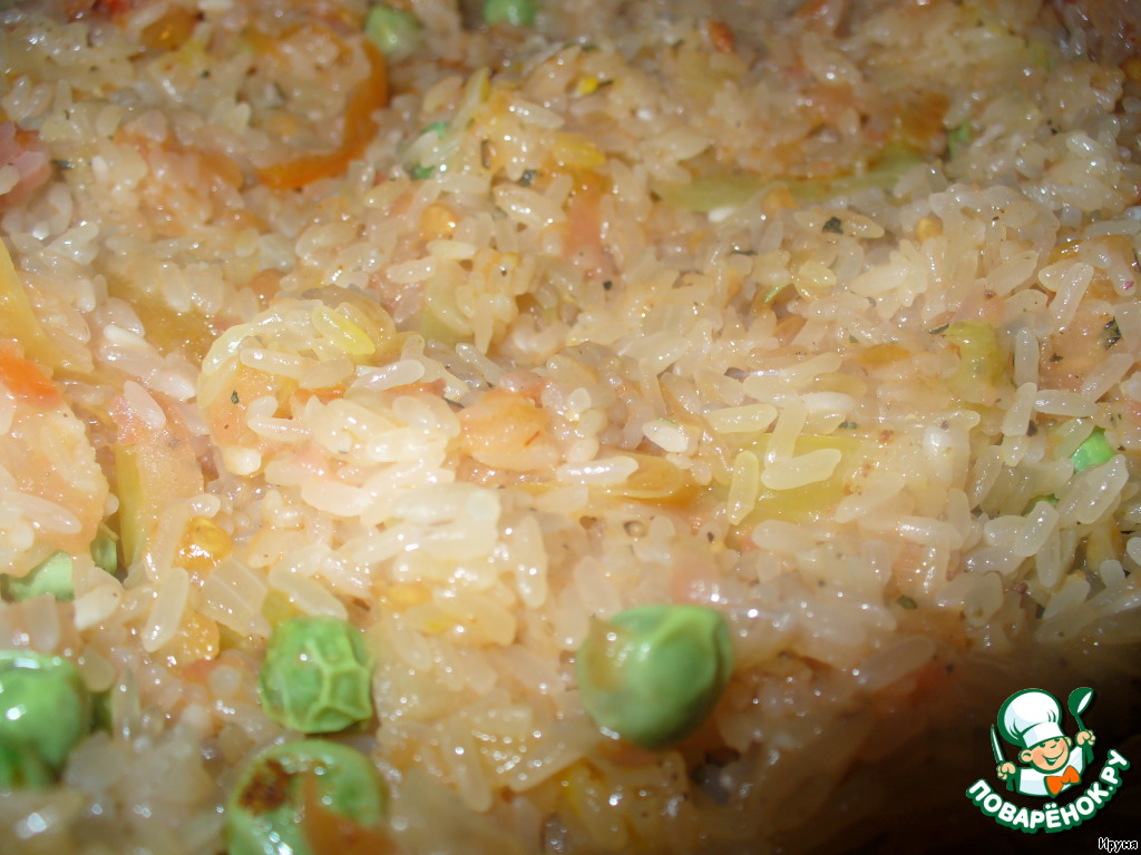 От воды, в которой "варились" морепродукты" отмерить 600 мл и залить ими рис с овощами. Прокипятить минутку, помешивая.