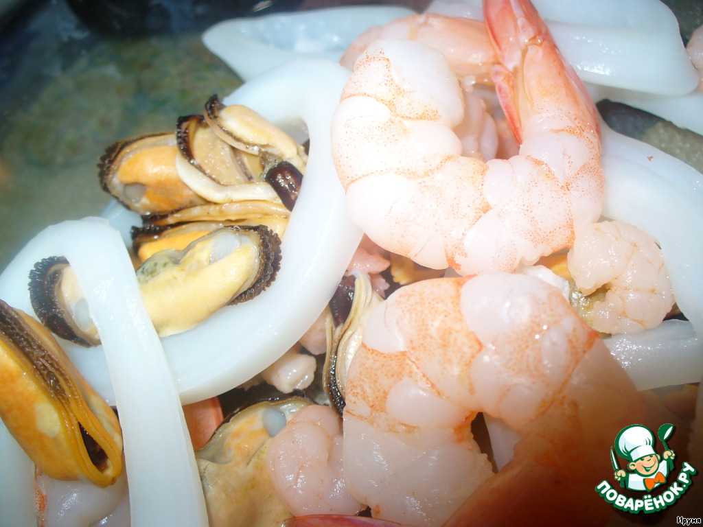Тем временем вскипятить воду в кастрюле, подсолить и опустить в неё замороженные морепродукты на 1 минуту. Откинуть на дуршлаг. Воду не выливать!!!