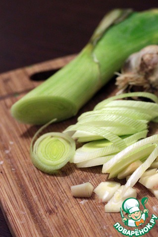 О, обычная лазанья, скажете Вы, ничем тут не удивишь. Я тоже так думала, пока внимательно не прочитала этот рецепт в книге моего любимого Оливера, я немного адаптировала его для конкурса, добавив крабовые палочки, а в остальном почти полностью сохранила оригинальный рецепт. Для начала чеснок и лук-порей крупно нарежем.