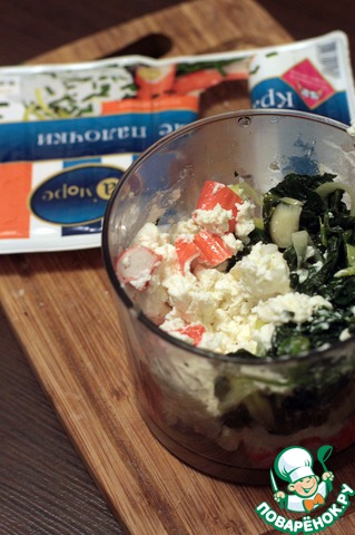 Положите в блендер рикотту, крабовые палочки А'море и шпинат с луком и чесноком.