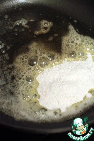 Приготовим бешамель - на сковороду выкладывайте масло, подождите, пока оно начнет пузыриться, затем добавьте муку, помешайте.