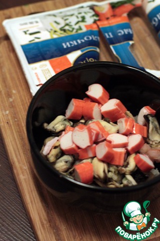 Для начинки нам также понадобятся размороженные морепродукты - мидии, креветки и еще немного крабовых парочек. Упаковка А'море разделена на 2 половину, в шпинатный соус я использовала 8 шт., а еще 4 оставила для начинки.