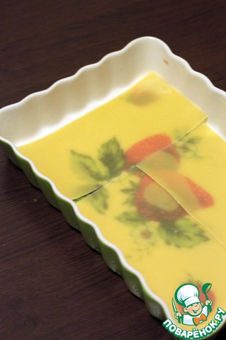 Включите духовку на 180 градусов, в жаропрочную форму выкладывайте отварные листы лазаньи. Если Вы в своей форме не уверены, то можно ее предварительно смазать маслом.