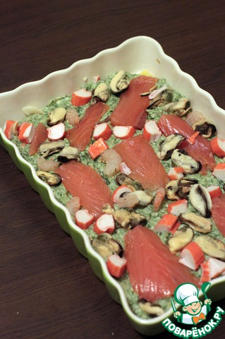 Выкладываем половину соуса, а сверху кусочки семги, морепродукты и крабовые палочки.