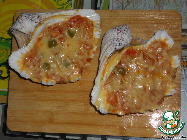 Мне очень понравилась идея подачи блюда именно в морских раковинах. Конечно же, я ее позаимствовала! Тут же, близ этого ресторанчика, продавали раковины моллюсков как сувениры, купив одну, дома я разделила ее пополам и сделала «тарелочки». В них-то я и подавала свое блюдо. Фото, к сожалению, одно, но с готовым результатом! – я никогда не думала, что мне понадобятся подобные фотографии, да и самих раковин благодаря ребенку уже в «живых» нет…