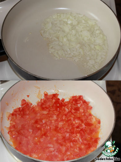 На масле слегка обжарила мелко нарезанный лук, затем добавила помидоры, нарезанные кубиками, и тушила минут 5