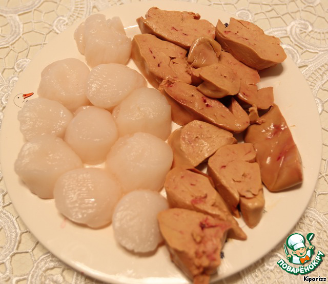 Гребешки хорошо размораживаем и промакиваем салфеткой, фуа-гру режим на кусочки. Постарайтесь нарезать ее на количество ваших гребешков.