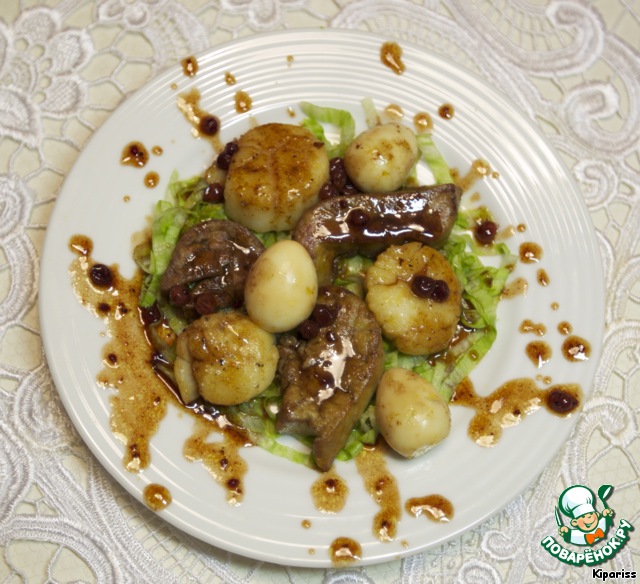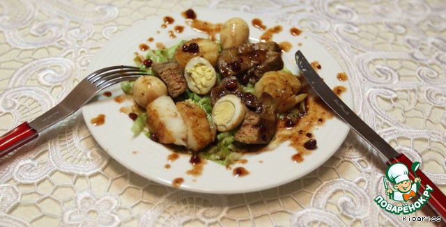 Выкладываем на тарелки кусочки фуа-гры, гребешков и яйца, хорошо поливаем соусом!