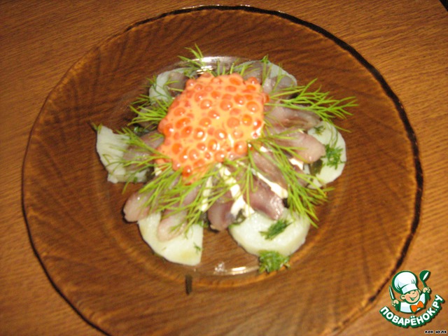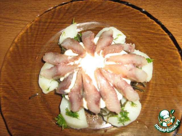 Как отваривать картофель я описывать не буду. Готовый картофель укладываем на тарелочку веером (я брала горячий).