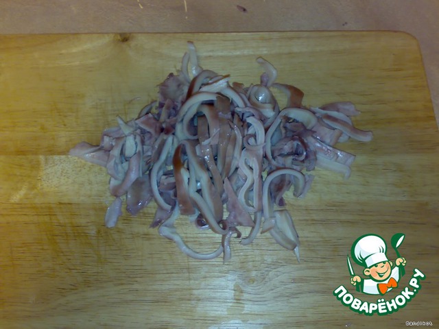 2. Кальмары отварить, почистить и порезать, по желанию, я резала соломкой