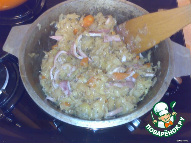 | ... Давно хотелось тушеной капустки, но с мясом - это обыденность, а почему бы не сделать с кальмарами?... :) |