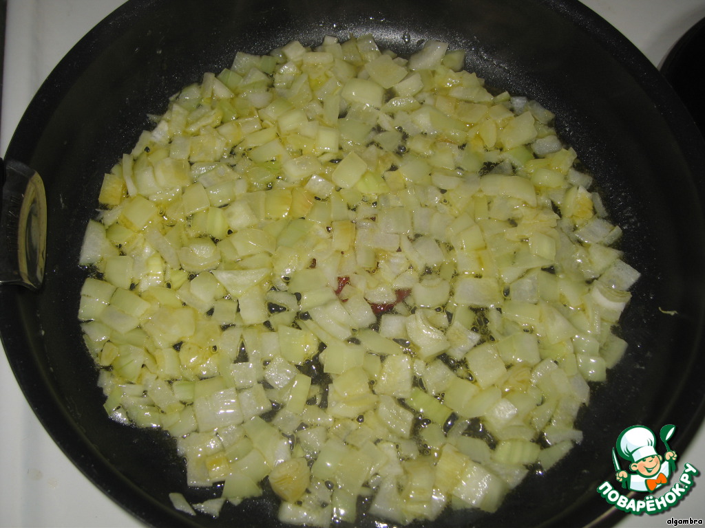 Лук чистим, нарезаем кубиками и обжариваем на растительном масле до золотистого цвета, примерно 5 минут.